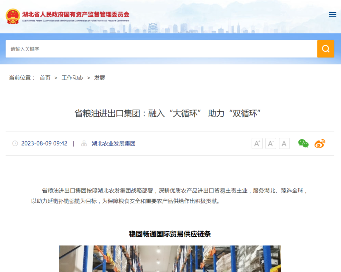湖北省國資委:省糧油進出口集團融入“大循環(huán)” 助力“雙循環(huán)”