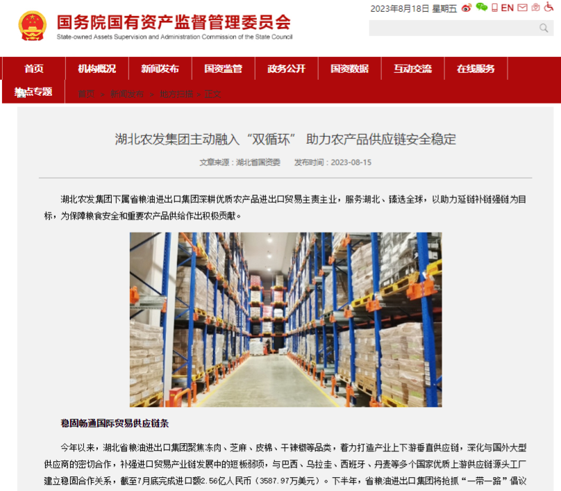 國務院國資委:湖北農發集團主動融入“雙循環” 助力農產品供應鏈安全穩定