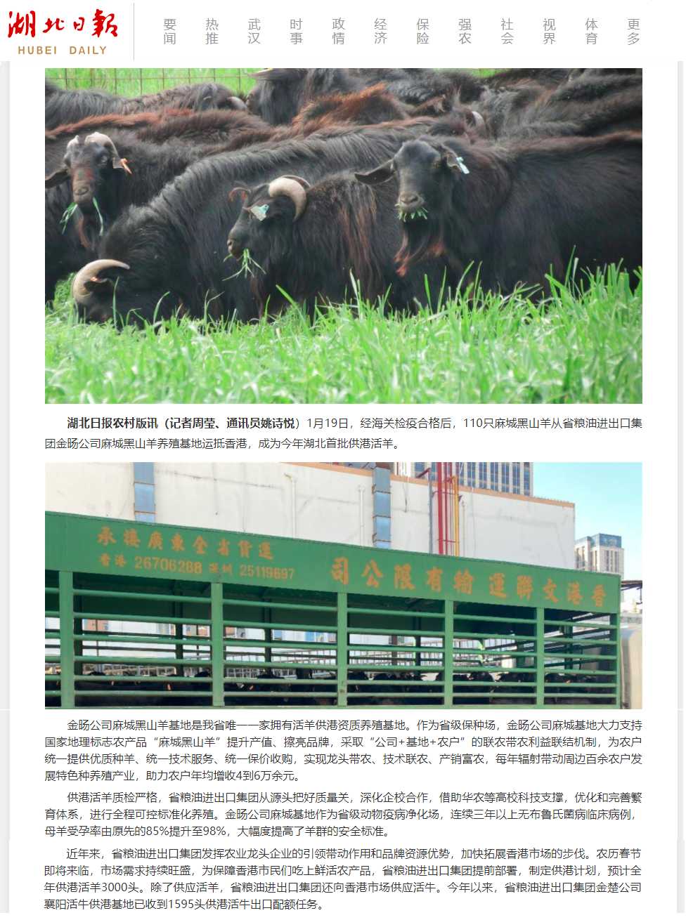 湖北日報:省糧油進出口集團今年首批活羊“奔”向香港市民餐桌