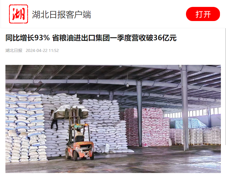 湖北日報:同比增長93% 省糧油進出口集團一季度營收破36億元