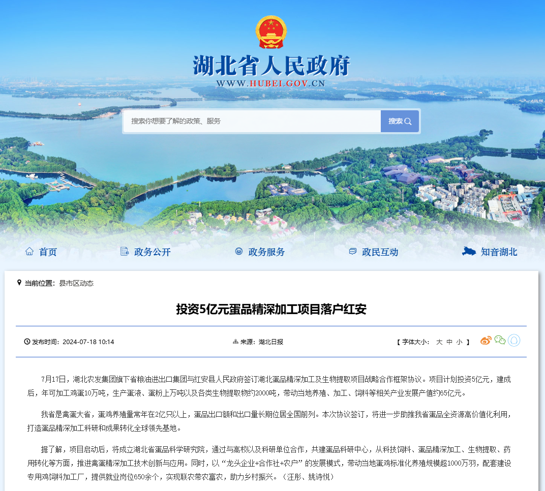 湖北省人民政府:投資5億元蛋品精深加工項目落戶紅安