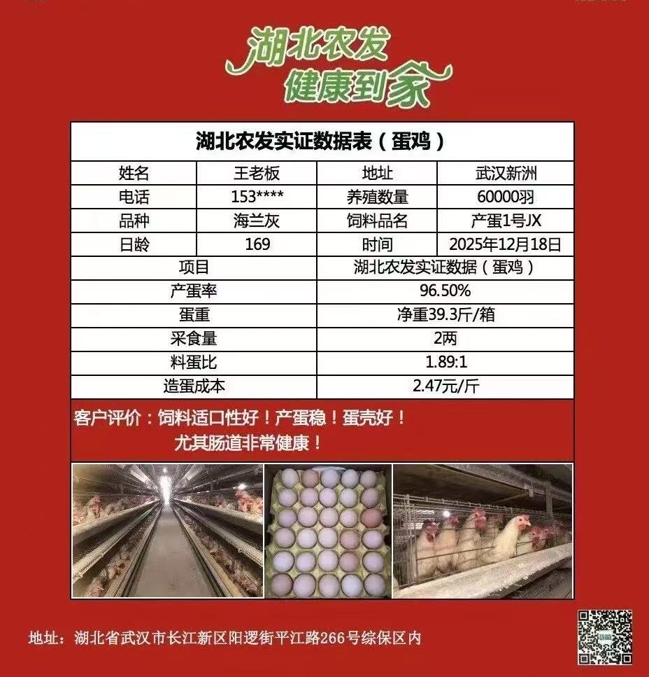 湖北農發集團旗下省糧油進出口集團湖北農發生物科技有限公司(以下簡稱:農發生物科技)坐落于長江新區武漢新港陽邏綜合保稅區,依托陽邏港區位優勢打造優質飼料供給體系,農嘉豐?系列“產蛋1號”飼料,在武漢新洲蛋雞養殖現場交出亮眼答卷:其6萬羽169日齡海蘭灰蛋雞,產蛋率達 96.50%,每箱蛋凈重 39.3 斤,料蛋比 1.89:1,造蛋成本僅 2.47 元 / 斤,實效獲養殖戶認可。